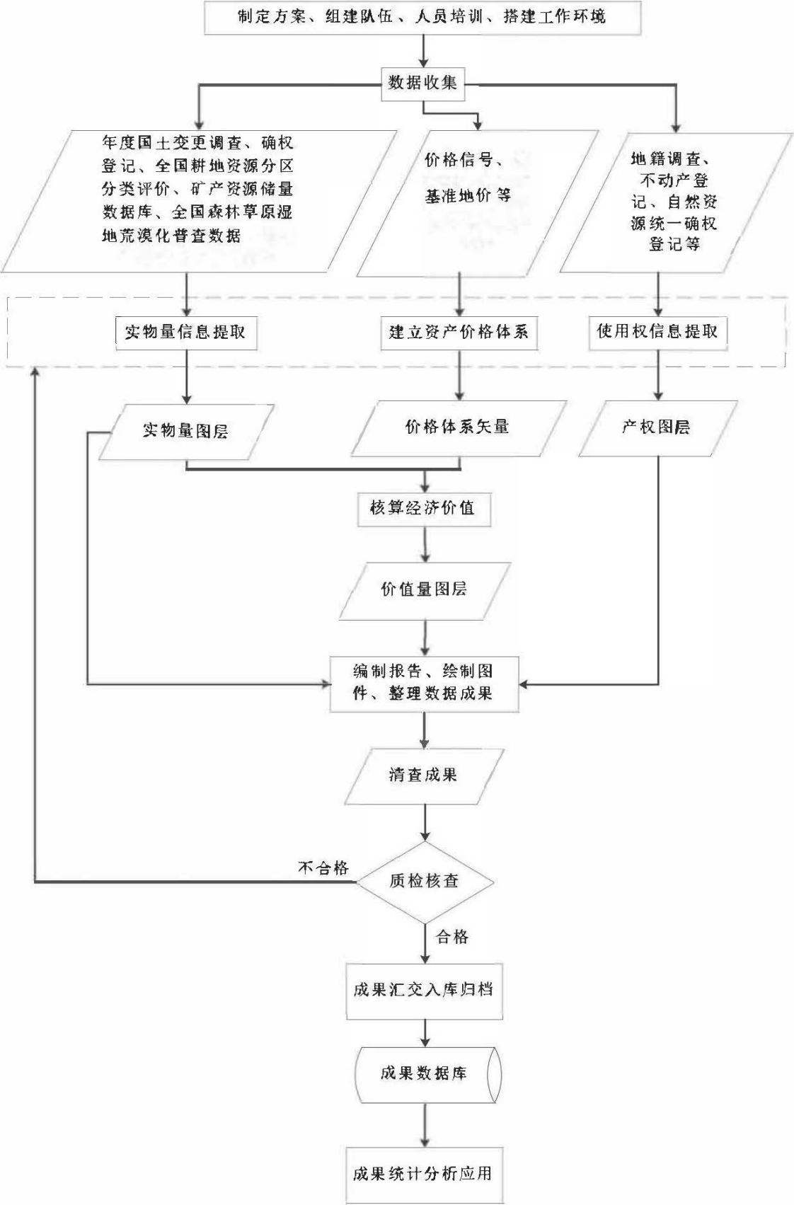 根據(jù)資產(chǎn)清查任務,資產(chǎn)清查技術路線包含工作準備、實物屬性清查、使用權清查、經(jīng)濟價值核算、成果核查質檢、成果匯交入庫、成果分析應用等階段,詳見圖1。
