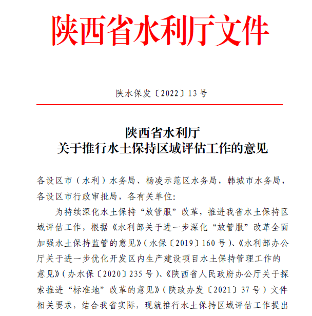 陜西省水利廳印發(fā)了《陜西省水利廳關(guān)于推行水土保持區(qū)域評估工作的意見》(陜水保發(fā)〔2022〕13號),強調(diào)持續(xù)深化水土保持“放管服”改革,推進陜西省水土保持區(qū)域評估工作。
