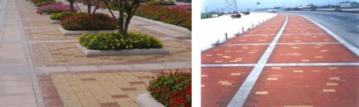 自行車道對(duì)于鋪裝平整度的要求與步行道相同,但對(duì)于圖案樣式與質(zhì)感變化的要求稍低。在自行車道的重要決策點(diǎn),包括起止點(diǎn)、轉(zhuǎn)折點(diǎn)和機(jī)非潛在沖突路口或路段等,可變換顏色,采用彩色鋪裝的形式,從而提示使用者注意前方路況或行駛安全。此外,采用不同顏色的彩色自行車道路面鋪裝可將機(jī)動(dòng)車道與非機(jī)動(dòng)車道清晰地進(jìn)行分隔,既減少不必要的隔離設(shè)施、節(jié)約道路空間,又比傳統(tǒng)劃線分隔更加清楚明朗,建設(shè)費(fèi)用更低。