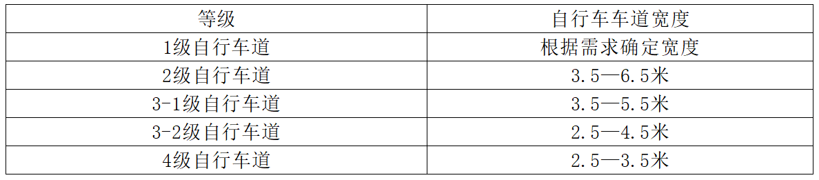 自行車道寬度是自行車通行的基本保證,一條自行車道的寬度應(yīng)為一個(gè)成年人的橫向?qū)挾龋?/span>0.6m)加上自行車運(yùn)行時(shí)兩側(cè)擺動(dòng)值各0.2m,故一條自行車道的寬度應(yīng)為1.0m。若有路緣石,其一側(cè)的0.25m路緣帶騎行者難以利用,因此需在車道總寬度中加上0.5m,即一條車道應(yīng)為1.5m,兩條車道為2.5m。若取最小寬度1.5m時(shí),騎行人會(huì)感到壓抑、拘束從而降低車行速度;而選擇太寬則容易被機(jī)動(dòng)車占道行駛。因此,針對(duì)不同的自行車道等級(jí),應(yīng)給出不同的寬度建議。