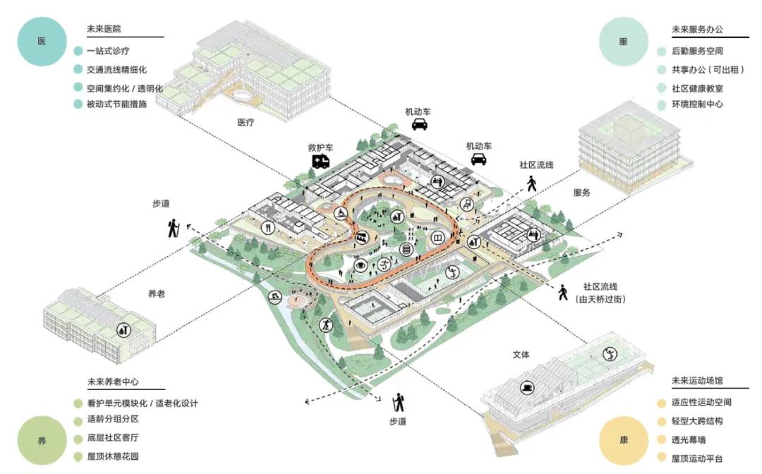 以重慶西永社區(qū)衛(wèi)生服務(wù)中心及養(yǎng)老中心方案設(shè)計(jì)為例,展示了如何將醫(yī)療、康復(fù)和養(yǎng)老服務(wù)緊密結(jié)合,并融入社區(qū)的日常功能中。設(shè)計(jì)方案將醫(yī)療、養(yǎng)老、文體、服務(wù)功能,通過一條環(huán)形公共健步道有機(jī)聯(lián)系成整體,這種設(shè)計(jì)不僅提供了必要的醫(yī)療和養(yǎng)老服務(wù),還通過與社區(qū)的密切聯(lián)系,增強(qiáng)了居民對健康服務(wù)的接受度和參與度,使得醫(yī)、康、養(yǎng)設(shè)施成為社區(qū)生活的一部分。通過這種整合,醫(yī)院和健康設(shè)施不僅是治療疾病的地點(diǎn),更成為了促進(jìn)社區(qū)健康和福祉的中心。這種模式的成功實(shí)施,展示了未來醫(yī)療設(shè)施設(shè)計(jì)的潛力,即在提供高效醫(yī)療服務(wù)的同時(shí),積極響應(yīng)社區(qū)的健康需求,構(gòu)建全面的健康支持系統(tǒng)。